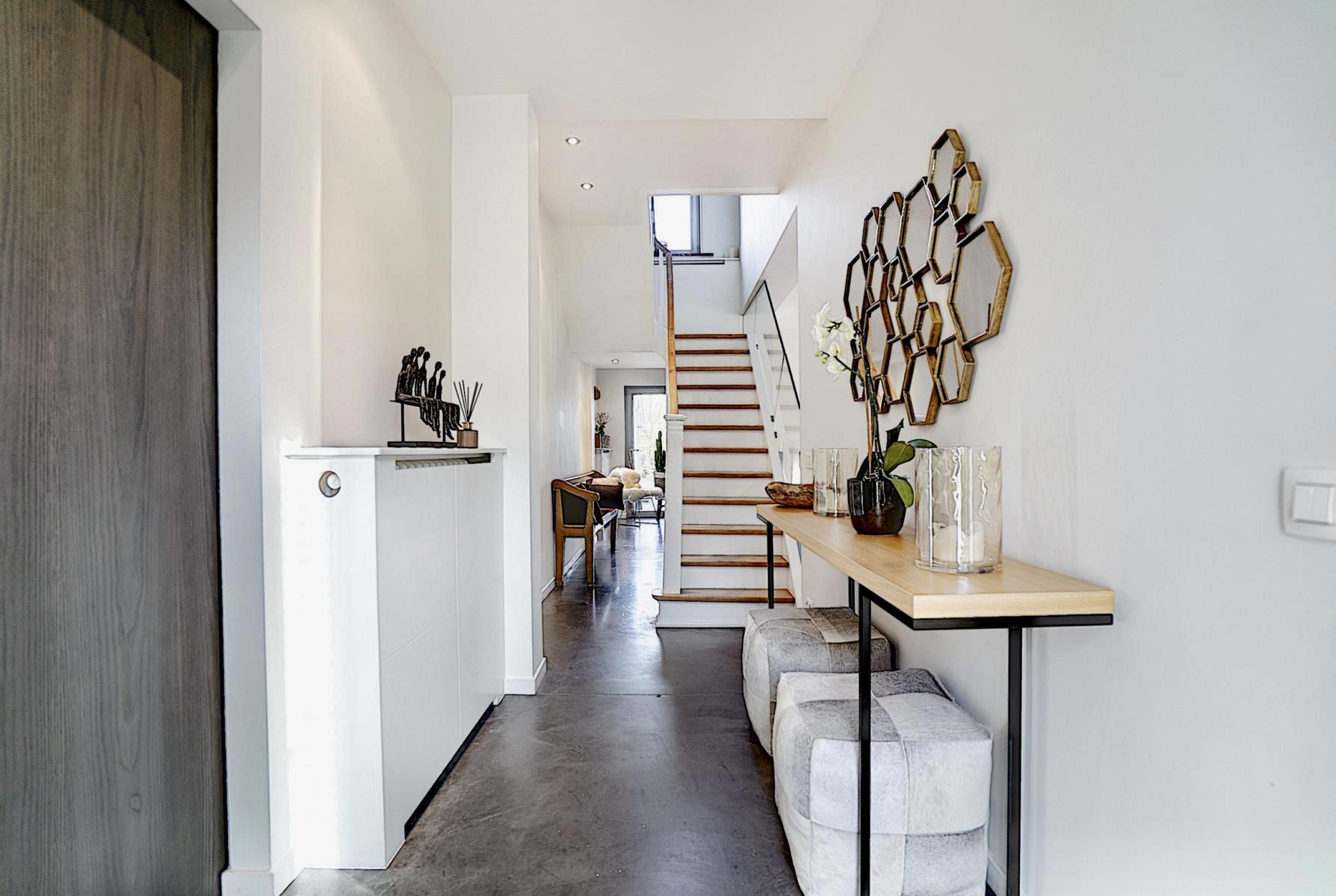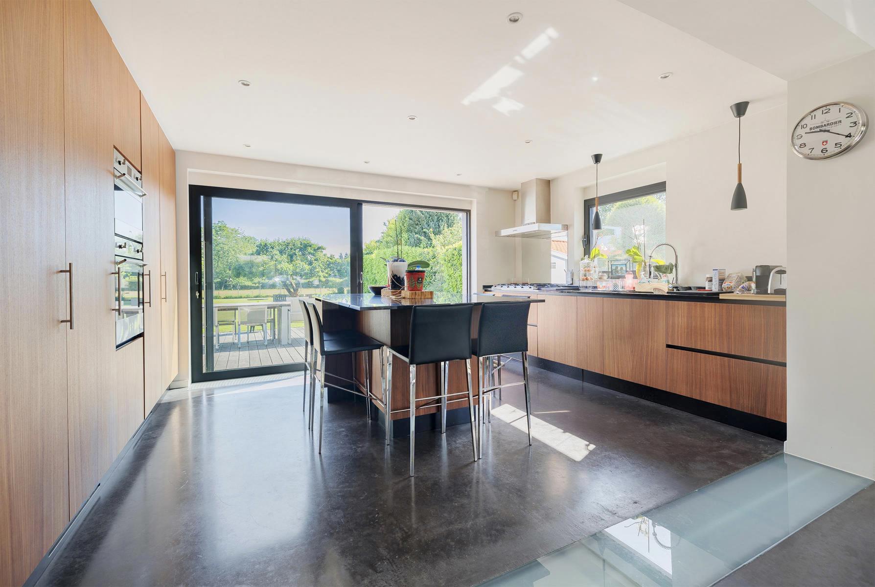 -au rez-de-chaussée: un hall d’entrée avec WC, un confortable salon TV (matériel intégré), une salle à manger, un salon avec foyer à cassette, une superbe cuisine ouverte hyper-équipée avec son coin déjeuner offrant une superbe vue sur le jardin et donnant accès à la terrasse, une buanderie et un débarras
