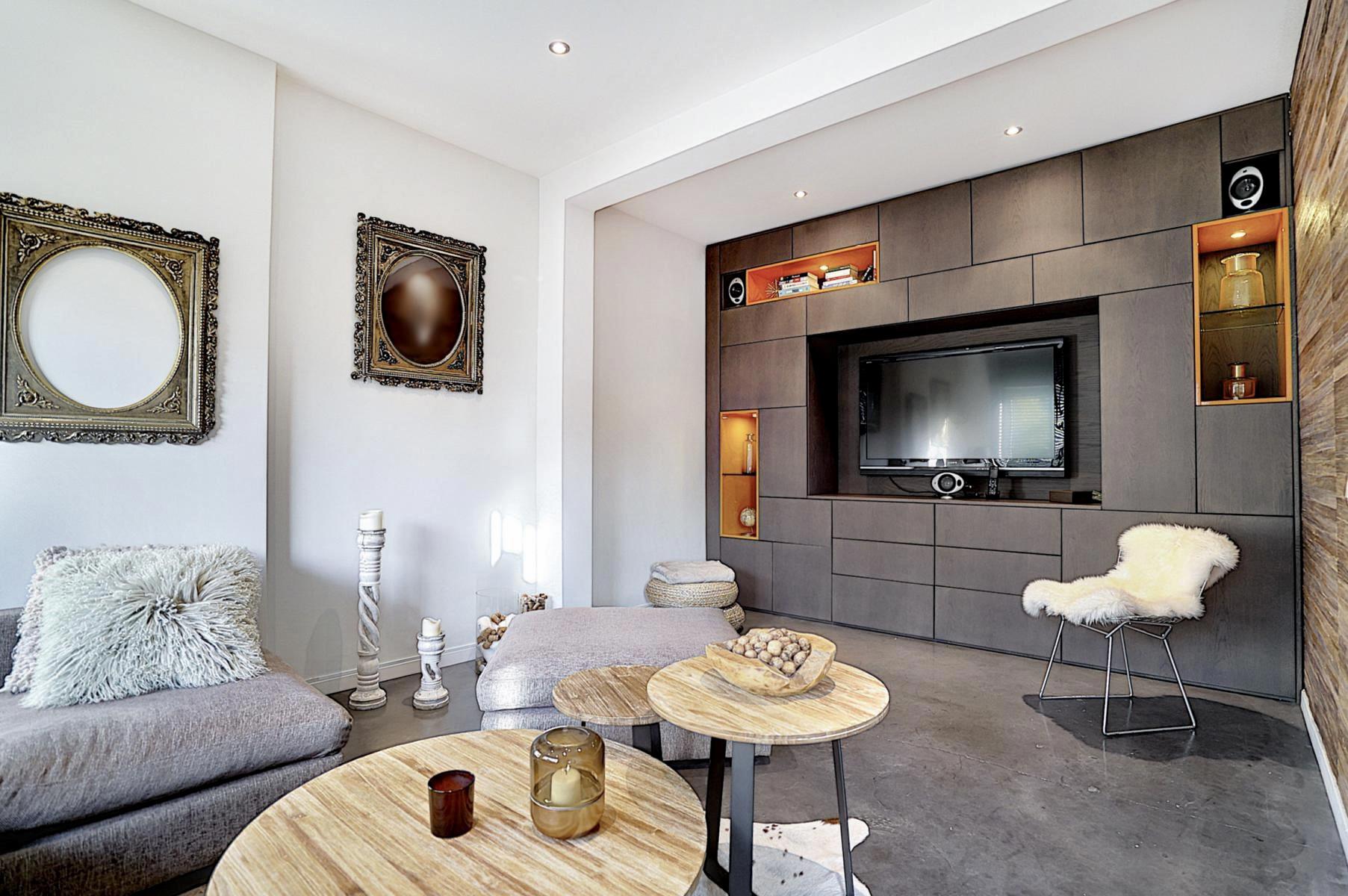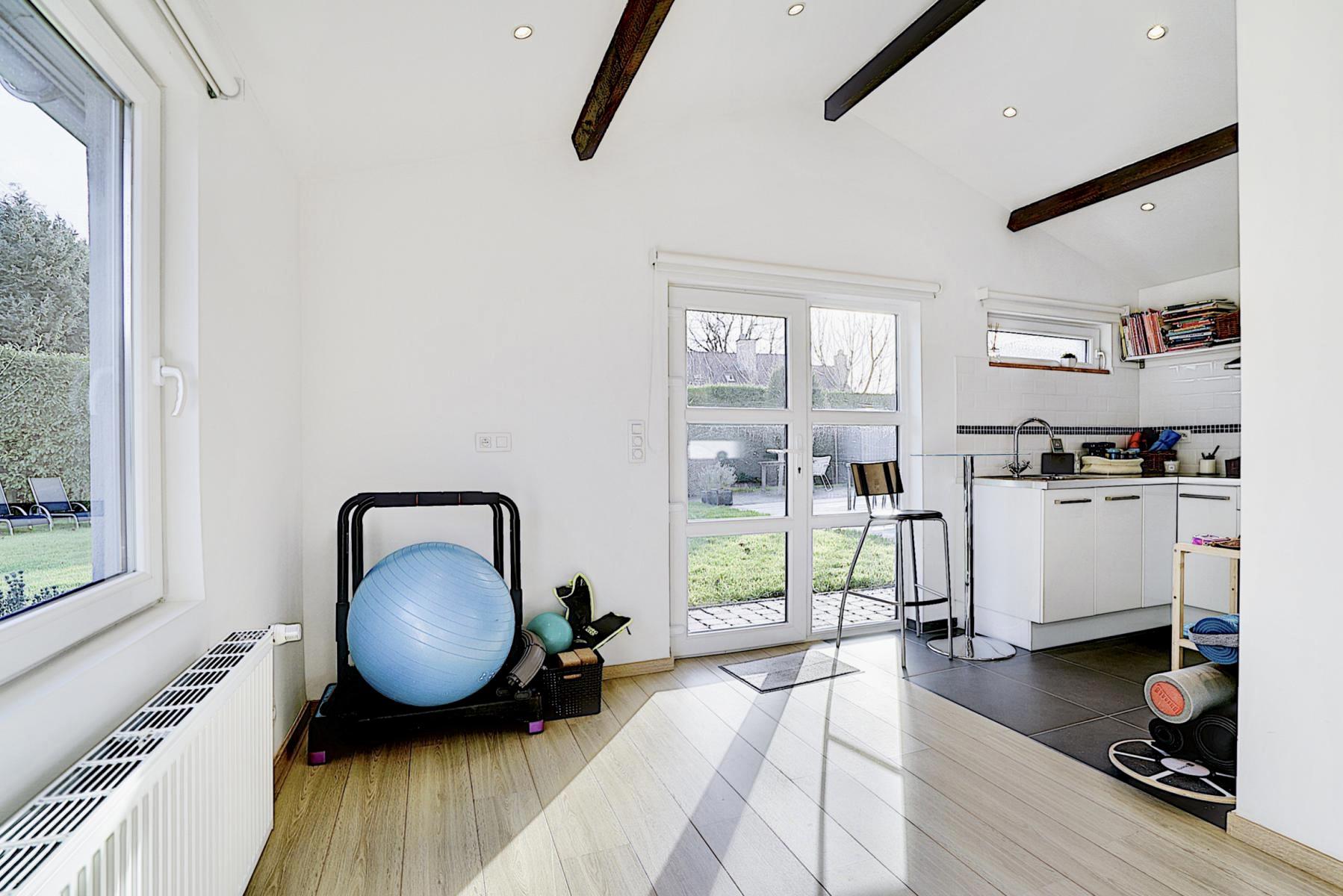 -au rez-de-chaussée: un hall d’entrée avec WC, un confortable salon TV (matériel intégré), une salle à manger, un salon avec foyer à cassette, une superbe cuisine ouverte hyper-équipée avec son coin déjeuner offrant une superbe vue sur le jardin et donnant accès à la terrasse, une buanderie et un débarras